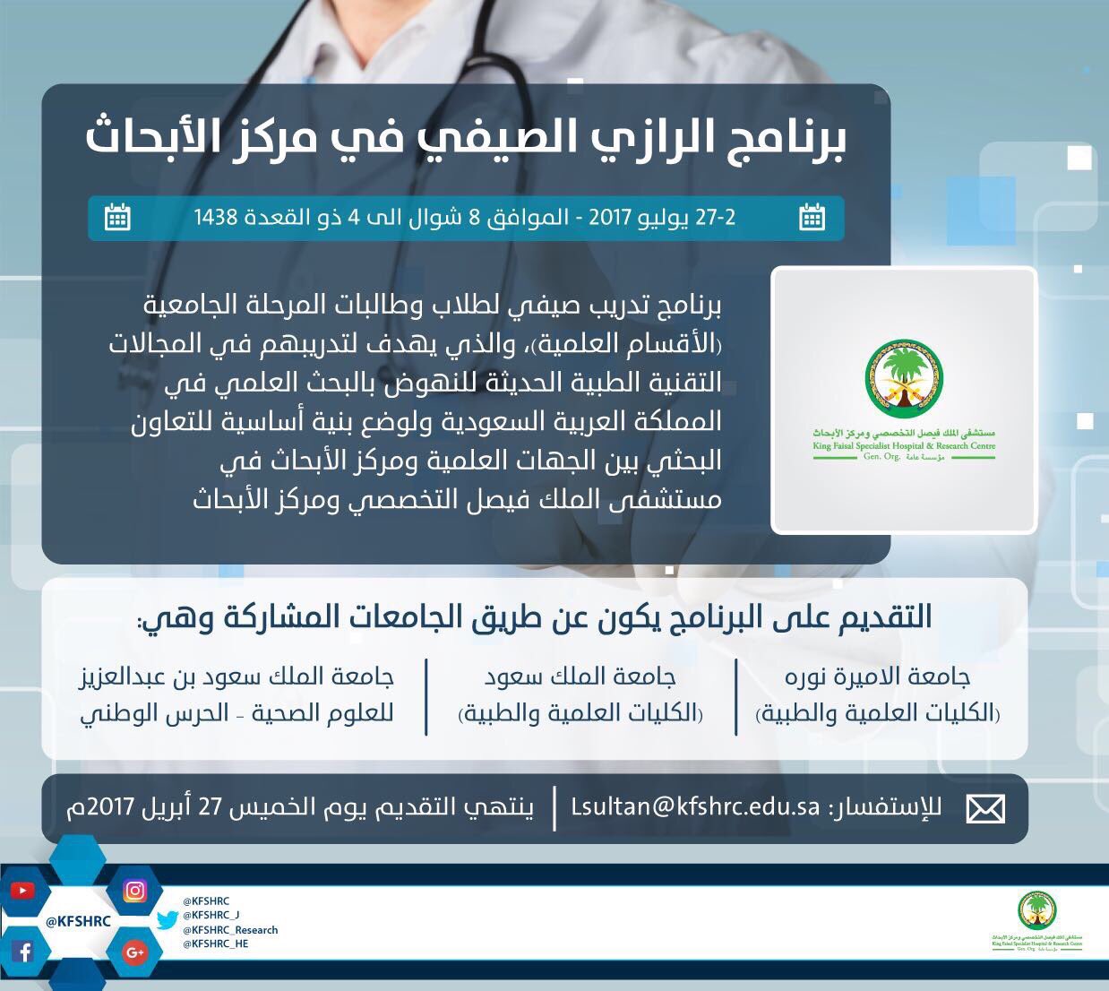 مركز الأبحاث A Twitter فرصة تدريبية لطلاب المرحلة الجامعية برنامج الرازي الصيفي في مركز الأبحاث مستشفى الملك فيصل التخصصي الرياض بحث علمي استثمار العقول Https T Co Zppxsxmwmv