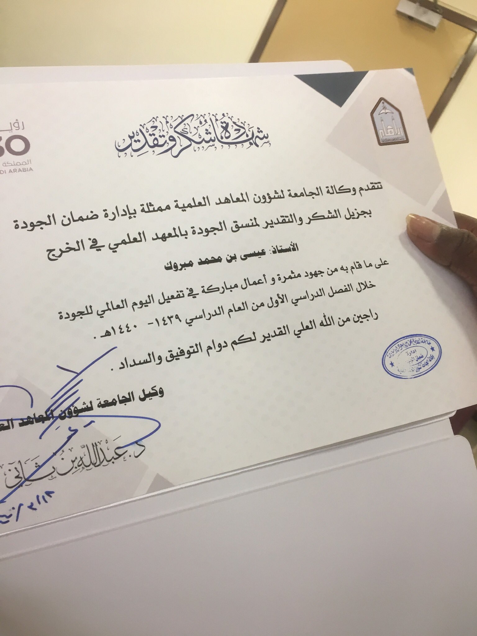 المعهد العلمي في الباحة Twitterren تلقى منسق الجودة بالمعهد الأستاذ بندر بن حسن الغامدي شهادة شكر وتقدير من وكيل الجامعة لشؤون المعاهد العلمية نظير ماقام به من جهود متميزة ومثمرة في